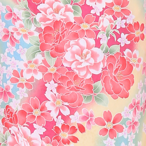 ブランド『H・L』の一品。桜地紋を施した鳥の子色を基調とし、躑躅(ツツジ)色や空色など淡色のぼかし入り。ぼかしに沿って、流れるように桜や八重桜・小花があしらわれたかわいらしく華やかな一枚。